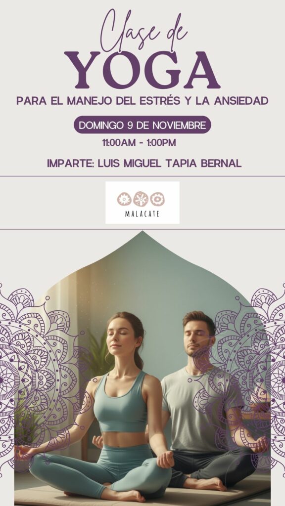 Publicado en 9 de noviembre de 2025 / 0 / Luis Miguel Tapia Bernal Clase de yoga para el manejo del estrés y la ansiedad Mapa no disponible Fecha/Hora Date(s) - 09/11/202511:00 am - 1:00 pm Categorías No Categorías Una clase de yoga para aprender a relajar y calmar la mente y el cuerpo. No se necesita experiencia previa.